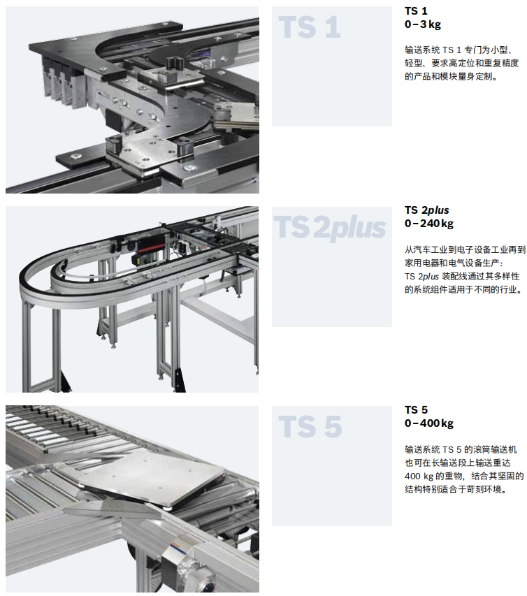 输送系统 TS4plus 可靠输送重达 250kg 的工件,主要应用于大工件和 重工件的生产加工,是汽车工业、汽车零部件供应工业、家用电器工 业、和消费品电子工业中的**选择。