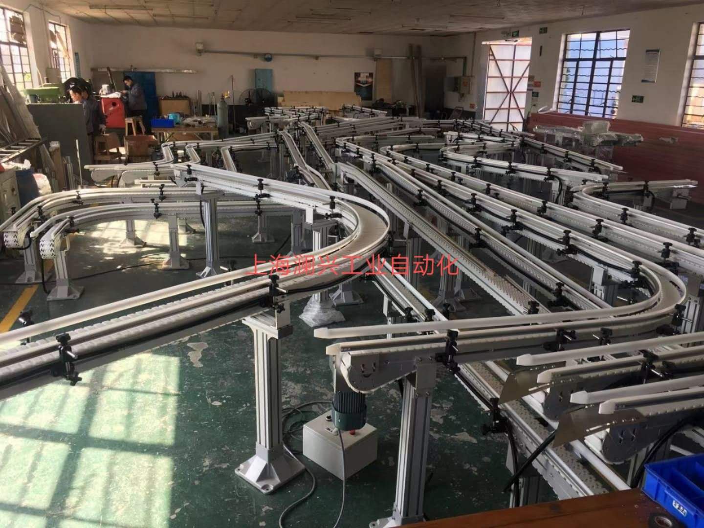 柔性输送线(柔性输送链)是一种由铝型材制作而成的输送梁,铝型材制作的支撑腿,高压压铸铝驱动模块,转弯铝型材和链板构成的一种输送方式。由于输送梁和支撑腿等部件均为是铝型材,便于快速切割,易于可长可短,可高可低,同时铝材便于弯曲,在安装现场便于直接修改长短和线体的高低,铝型材重量较轻,工作人员工作强度较小,便于制作出我们需要的输送线体路径,所以称之为柔性输送线。